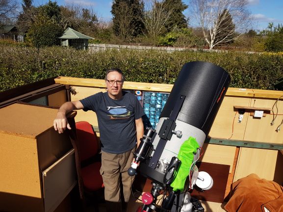 Here I am in my roll off roof observatory; see the Observatory page for details of how I built it and my equipment setup.