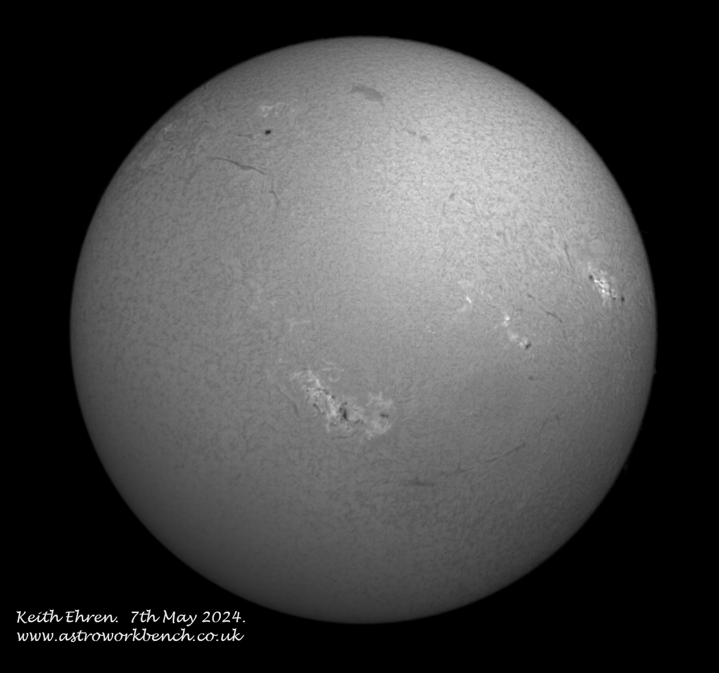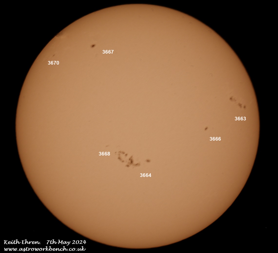 7th May 2024. Solar activity continues to increase with solar max now forecast to be around late '24 to early '26 (source NOAA). The two images below show the Sun in white lights and Hydrogen alpha a few minutes apart.