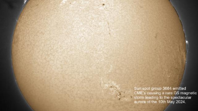 10th May 2024. A huge Sun spot group (3664) fired off a bunch of CME's that resulted in a very rare G5 magnetic storm that in turn resulted in the major Aurora of the 10th May. My Ha (Hydrogen Alpha) image below shows the sun spot group and one of my aurora images. Also included is my all sky camera time lapse video of the aurora.