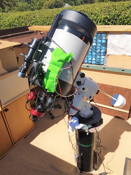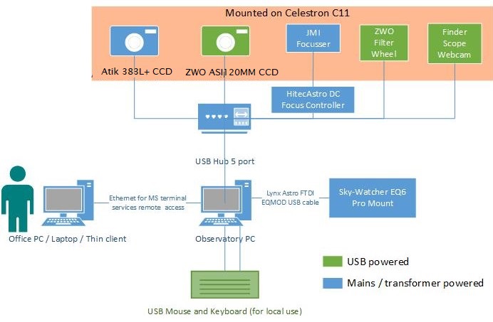 The diagram and photos below show the connectivity of my scope/mount and PC with the imaging setup components. This setup allows for remote control (office PC) or local (observatory PC) control.