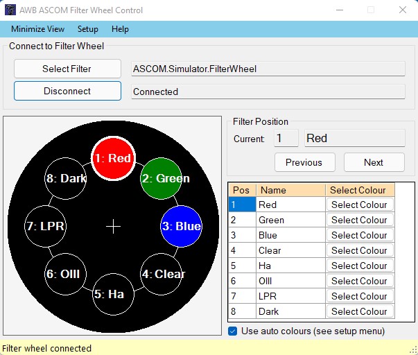 I created this application to control my USB connected ZWO Electronic Filter Wheel (EFW), it should however work with any ASCOM compliant filter wheel once the correct ASCOM driver has been installed.