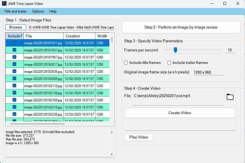 I created this application to produce a video from individual jpeg images captured during an observing run of an all sky camera, or any other camera used to take a large sequence of jpeg images.
