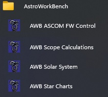 Each download consists of a zip file that contains a setup.exe file which installs the application under a Windows Program Group called AstroWorkBench as shown in the example Windows 11 program group image below. The installation also checks for the applicable .Net runtime version, and if not already present on your PC it will be downloaded from Microsoft. I currently run my applications on Windows 10 and 11 PCs and Laptops.